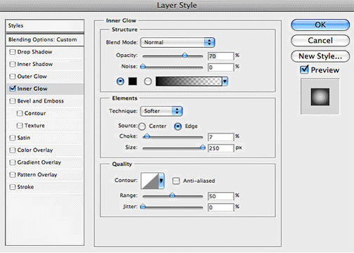 Lastly create a new layer and fill it with any color. Place this layer on top of all other layrs. Drop the fill down to 0%. Open the Layer Styles box and change the inner glow to the following settings and click OK.